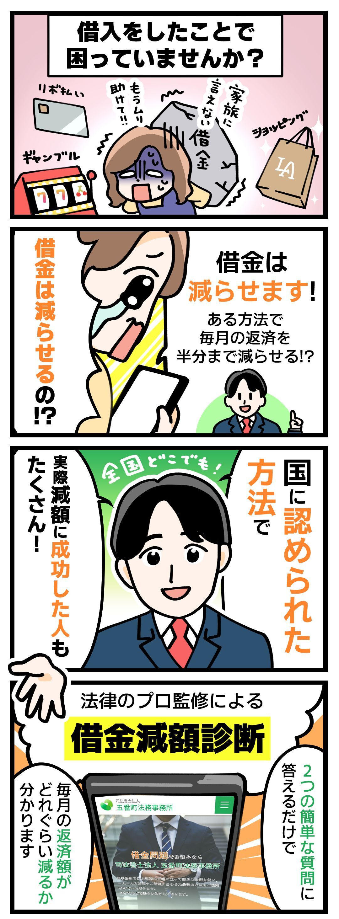 パチンコ、競馬、ギャンブルで300万円の借金を作ってしまい、結果4社から返済に追われる日々送ってました。任意債務整理するか悩んでる時に、借金減額診断で借金をどれぐらい減額できるか診断してみたら「こんなに減るか!」って驚きました!人生どうなるか絶望していたんですが、今は無理のない返済プランを立てることができ、1からがんばろうと思います