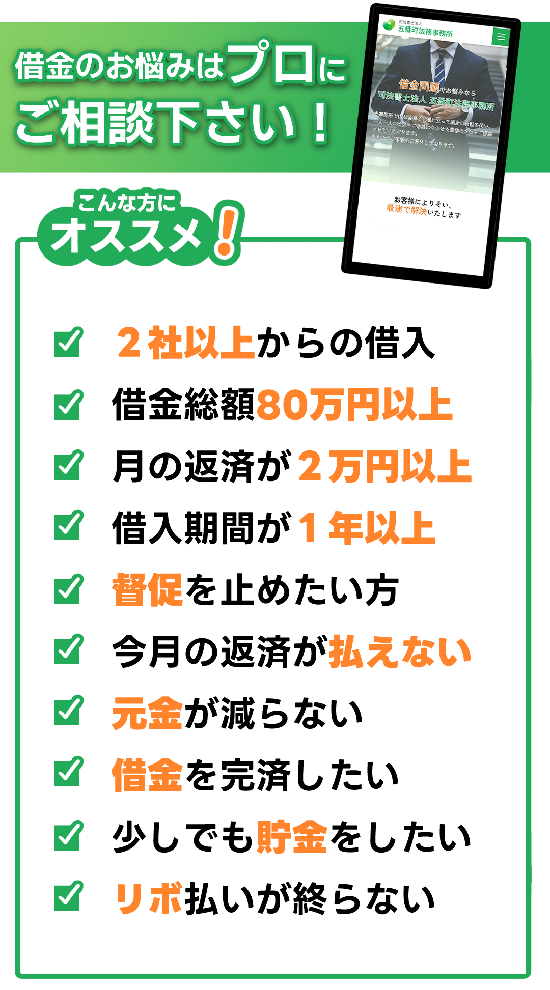 自業自得ですが、軽い気持ちでショッピング、キャッシングのし過ぎが原因でリボ払いの返済額が120万円程に膨らみました。一緒に暮らしている婚約者にバレないかいつもひやひやしていましたけど、借金減額診断を使ってみたら、家族にバレずに完済できました!本当にありがとうございます!